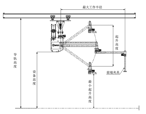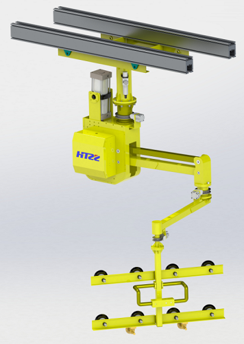 軌道移動式:將鋁合金導軌懸掛于廠房支撐梁或者現場安裝的立柱梁上,助力機械手通過滑動小車安裝于導軌上。控制滑動小車移動的方式可分為電控、氣控和手動。根據現場的工作環境以及安裝空間,導軌移動式助力機械手可在空間上實現前后、左右的多方位長距離或短距離的行走,可通過導軌上的限位及緩沖實現位置極點的控制。其優點在于只占用廠房已有的上部支撐梁實現與地面無干涉的工作。